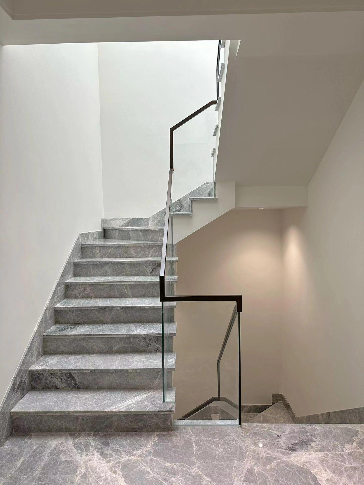 Natural marble stair treads, bathroom anti-slip grooved marble, and marble door sills.